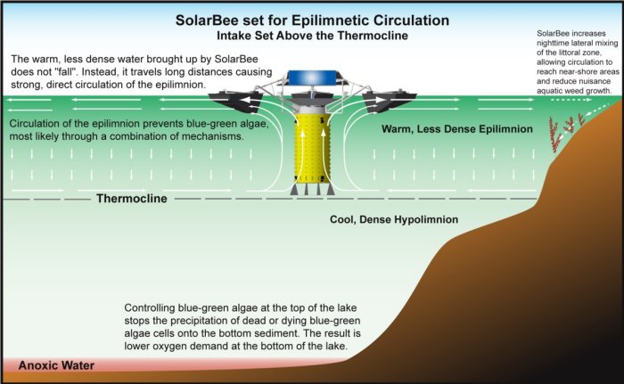 Recreation and lakes go hand in hand whether it`s fishing, water sports, or just a relaxing vista. Time on & near the water is extremely valuable and even minor water quality issues can have a major impact on your experience. The key component for effective cyanobacteria (blue-green algae) control and overall water quality improvement is to actively circulate just the upper water of the lake known as the "epilimnion". Active epilimnetic circulation also benefits the fishery & the food chain that supports it.
