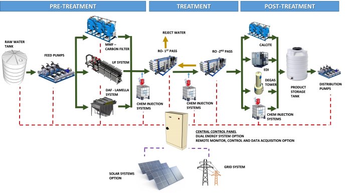 Note: Required 3bar (45psi) minimum customer supplied pressure to high pressure RO Feed Pump. Temperatures and high salinities will reduce system productivity