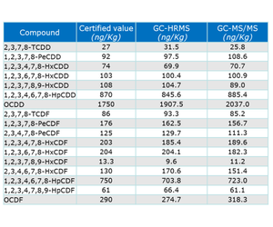 To validate the method, several commercially available certified reference materials were analyzed. Reference materials were split in two aliquot parts: one analyzed by 8900 GC-TQMS and the other sent to an external laboratory for analysis by GC-HRMS.