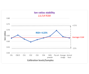 To check performance of the method in real samples, an animal feed sample was doped with dioxins at very low levels. Recovery rates of stable isotope labelled internal standards was 60-120%. For every analysis, Compass TQ software checks ion ratios tolerance (RQ score) for each target compound allowing the user to have confidence in compliance with regulatory standards. Ion ratio QC was found to have a tolerance of ± 15%. Figure 8 shows the stability of the ion ratios for 2,3,7,8-TCDD once the complete batch performed for calibration standards and samples is completed.