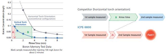 - Offering the highest level of robustness, the sample injection system (vertical torch orientation) is designed to minimize torch clogging and memory effects. Even with boron, which tends to produce memory effects, measurements can be repeated with short rinse times, thus resulting in a shorter analysis time.