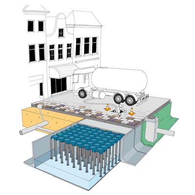 Tank maintenance is made possible by the large walkable spaces inside the tank, created through the combined use of the Atlantis system and the Beton Up accessory.