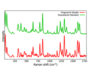 Figure 2 reveals a different story to what the human eye could see. We can now see deposits of small particles over the fingerprint, shown in red. The microscope has done its job in allowing the investigator to see the trace particles present, now the spectroscopic identification comes in to play. Thanks to Raman spectroscopy’s fingerprint-like chemical identification, the Raman spectrum from these particles can easily be identified as paracetamol (Figure 3), by comparing against a library of known drug spectra. This same principle can be applied for identified traces of drugs and explosives left behind in a fingerprint during forensic analysis.