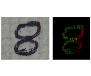 First, a white light stitched image across the full sample was taken over the number 8, left image in Figure 4. To the human eye, even under the microscope, the number 8 looks like it could be genuine and from one ink source. However, the PL map shown on the right of Figure 4 clearly identifies two different ink sources based on their different peak wavelengths. Figure 5 shows the PL spectra extracted from the red and green regions of the map; we can see from the map how the ink represented in green was applied to turn the 3 into an 8 using the difference in PL peak position.