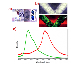 Figure 6a) shows the sample that was placed under the microscope, a £20 Clydesdale Bank polymer note bearing the portrait of Scottish king Robert the Bruce. An area of his beard, top figure 6b), was chosen for PL mapping. The PL map, bottom figure 6b), is coloured with the two PL contributions, one in green and one in red based on their peak wavelengths. These spectra are shown in Figure 6c) where it is clear to see the two PL contributions have significantly different peak positions. This a rapid way to check the authenticity of a bank note during forensic analysis under a Raman microscope to show the PL is occurring at the expected wavelength.