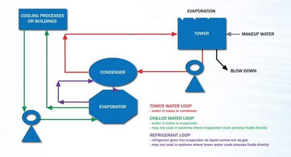 A typical industrial or institutional cooling water system is arranged like the schematic in Figure 1. There are typically two water loops and a refrigerant loop. Chilled water is circulated in the chilled water loop through the apparatus or building that needs cooling. Heated water is returned through an evaporator where refrigerant is evaporated by the heat from the warmer chilled water. This refrigerant is compressed and condensed by cooler water returning from a cooling tower in a tower water loop. Solution 3000 can solve serious problems caused by microorganisms in both loops of the system through which water circulates.