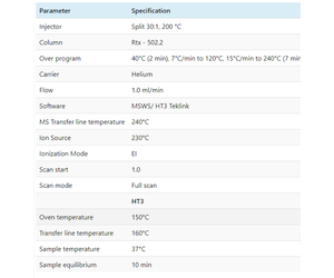 Infant formula was obtained locally. The infant formula consists of 1 mL for both the calibration curve and samples. The infant formula standards and samples were evaluated with dynamic headspace at 37 °C. Seven samples of infant formula were prepared to determine reproducibility and accuracy.