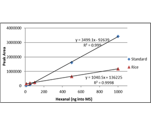 The hexanal curves from 10 ng to 1000 ng of standard and spiked rice including the correlation coefficient (r2) are shown in Figure 2. The hexanal standard curve from 10 ng to 1000 ng in water and infant formula including the correlation coefficient (r2) are shown in Figure 3. The difference between the slopes of the lines confirms that matrix matching must be performed when testing hexanal in rice or infant formula samples.