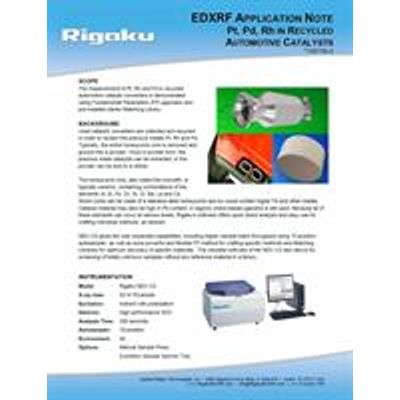 Used catalytic converters are collected and recycled in order to reclaim the precious metals Pt, Rh and Pd. Typically, the entire honeycomb core is removed and ground into fine powder. Once in powder form, the precious metal catalysts can be extracted, or the powder can be sold to a refiner. The honeycomb core is typically ceramic, containing combinations of the elements Al, Si, Fe, Zn, Sr, Zr, Ba, La and Ce. Some cores can be made of a stainless steel honeycomb and so would contain higher Fe and other metals. Catalyst material may also be high in Pb content, in regions where leaded gasoline is still used. Because all of these matrix elements can occur at various levels, the fundamental parameters software with matching Library offers quick direct analysis, of powdered catalytic converter cores, without the need for a large suite of calibration standards.