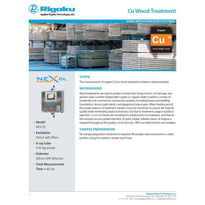 Ammonia Copper Zinc Arsenate (ACZA) is often used to treat wood species that do not easily retain other treatments, such as Douglas Fir. When treating wood, the proper balance of treatment solution must be monitored to ensure the highest quality while minimizing waste and excess cost due to treatment usage or product rejection. Cu, Zn, and As levels are monitored in solution prior to treatment and then in the wood to ensure proper retention. A quick, simple, reliable means of analysis is required throughout the quality control process. XRF is an ideal tool for such analysis.