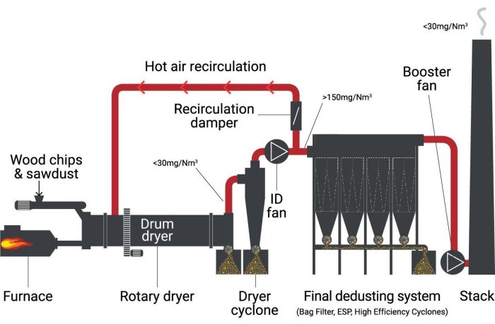 The drying of biomass is common to many industries, including wood pellet making, panel boards and many others, from coffee to olive-oil or animal feed. Technologically, these industries operate drum / rotary dryers to dry biomass. It can be a raw-material or a fuel for the manufacturing process. The pellet making industry presents a typical general arrangement which is replicated in other industries. It includes a “dryer” cyclone after a rotary dryer which is heated by a furnace (generally burning biomass). Usually, a fraction of air is recirculated back to the dryer for energy recovery.