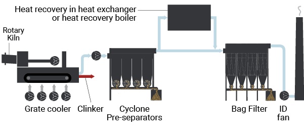 In new generation cement plants, the hot gases are used for heat recovery, such as heating a mill for the grinding of pet coke, heating a limestone dryer or to enable heat recovery in exchangers or recovery boilers.