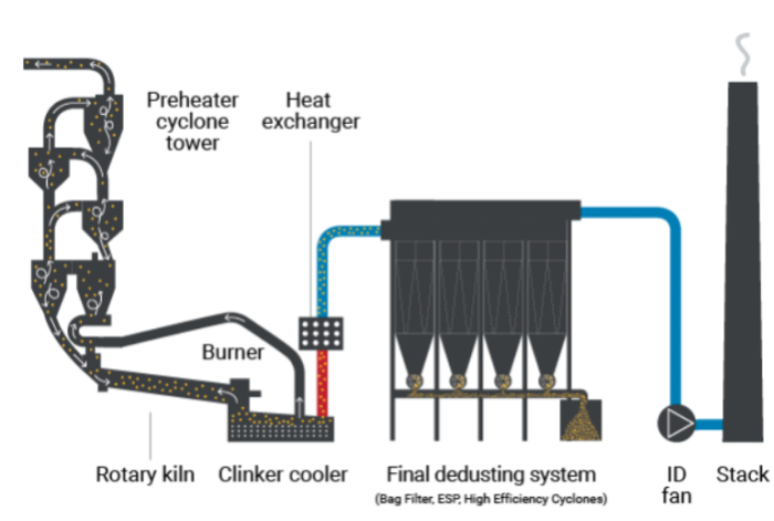 The general arrangement of a cement plant includes two main exhaust gas streams: the clinker coolerand the pre-heater tower.