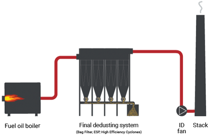 - The general arrangement of a fuel oil combustion plant is the use of final dedusting system immediately after the fuel oil boiler.