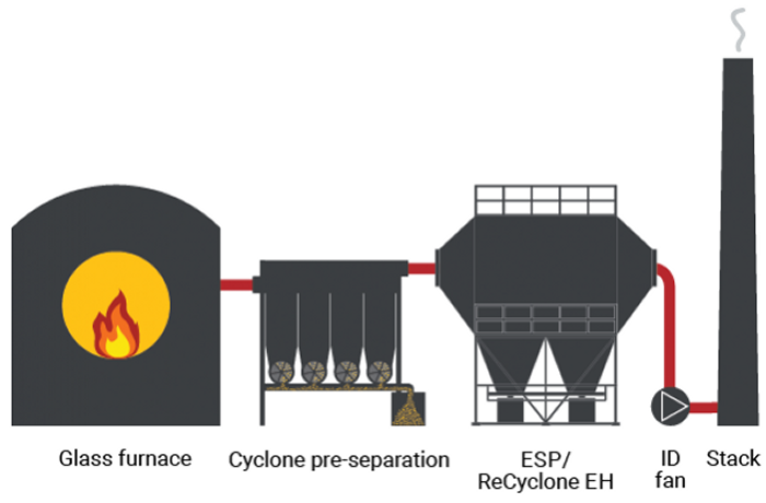 The general arrangement of a Glass making industrial line typically includes a Natural Gas furnace followed by an ESP as the End Stage Deduster. Changing to biomass fuel increases the level of particulate emissions that need to be removed before the stack (< 5µm).
