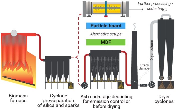 In the panel board industry, many factories cannot run at full capacity due to glowing particles carry over to downstream equipment, such as direct heated dryers (particle board), which can cause fires. In other cases, a second stage dedusting is needed to further reduce ash that can deposit in the panelboards (MDF).