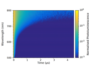 In order to confirm the presence of traps, the time response of the photoluminescence was measured using the TCSPC functionality of the FS5; since trap emission and band-edge emission occur on different timescales. A 405 nm picosecond pulsed diode laser (EPL-405) was used to excite the sample and the photoluminescence decay measured as a function of wavelength to build up the time-resolved emission spectrum (TRES) shown in Figure 4. The TRES map clearly shows that the photoluminescence lifetime substantially increases at longer emission wavelengths.