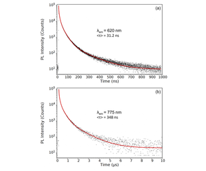 To determine the photoluminescence lifetimes, the decay at the band-edge emission peak (620 nm) and tail emission region (775 nm) were measured with higher temporal resolution and 105 counts at the peak and the decays fit with four exponential components using the FS5’s Fluoracle® software (Figure 5). The band-edge emission peak was found to have an average photoluminescence lifetime of 31.2 ns while the lifetime of the tail emission is 348 ns.
