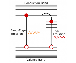 The fact that tail region decay has an order of magnitude greater lifetime provides further evidence that it is arises due to trapping within the InP/ZnS QDs. A potential mechanism is shown in Figure 6 where electrons at the conduction band edge become trapped at surface defects on the indium phosphide core that have energies within the bandgap. These trapped electrons then slowly radiatively recombine with holes in the valence band, emitting light at a longer wavelength than the band-edge emission. The presence of traps suggests that the ZnS shell may be incomplete and the InP is therefore not fully passivated and that the synthesis procedure should be adjusted to deposit a thicker ZnS shell.