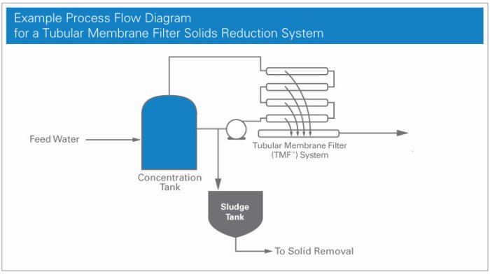 Typically, between 75 and 95% of the water passes through as permeate and is sent to the RO or Nanofilter system. The concentrate is recycled up stream of the TMF Modules at the Concentration Tank for re-dilution. Solids concentration is kept at 3-5% with the excess solids sent to a filter press for de-wetting or to disposal. The number of Tubular Membrane Filter Modules required is dependent upon the total flow rate requirement of the system. The modules are typically placed in series, or train, of up to 12 modules and systems is usually designed to allow at least one train of modules to be independently taken off line for routine maintenance cleaning. To support system design, a small pilot test system can be used to determine capacity and identify any issues, such as colloids, that might require further module cleaning.