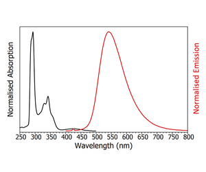 The absorption of CzDBA has maxima at 290 nm and 340 nm with a long tail extending out to 500 nm. The emission spectrum is broad and featureless with an emission maximum at 550 nm and a FWHM of 95 nm, which corresponds to colour coordinates of 0.37, 0.58 in CIE 1931 colour space.