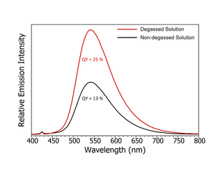 An initial check for the presence of TADF emission is the measurement of the photoluminescence quantum yield in the absence and presence of oxygen. Since TADF involves RISC from the T1 state then any mechanism that removes population from the T1 state will decrease the intensity of the TADF emission. Molecular oxygen has a triplet ground state and will therefore readily remove population from the T1 state through energy transfer and quench the TADF emission. The change in emission intensity when the CzDBA solution is exposed to oxygen is shown in Figure 5. The photoluminescence quantum yields were measured using the SC-30 Integrating Sphere Module of the FS5. The substantial 50% reduction in quantum yield when the solution is exposed to oxygen suggests that the T1 state is involved in the emission process and is the first indicator that the emission could contain TADF.