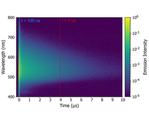 One method to determine whether the origin of the delayed component is delayed fluorescence or phosphorescence is comparing the spectral shape of the prompt and delayed components by acquiring a time-resolved emission spectrum (TRES). In a TRES measurement, the emission decay is measured as a function of emission wavelength to build up a three-dimensional time-resolved spectrum (Figure 8a). The TRES data can then be sliced to generate a snapshot of the emission spectrum at a specified time after the laser flash. Two TRES slices showing the shape of the prompt component (100 ns after flash) and the delayed component (4 μs after flash) are shown in Figure 8b. It is clear that the spectra of the prompt and delayed components are identical which suggests that the delayed component is delayed fluorescence since phosphorescence from the T1 state would occur at a longer wavelength than the fluorescence due to the lower lying energy of the T1 state.