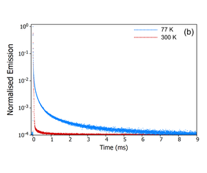 The second method to determine the origin of the delayed component is measuring the temperature dependence of the decay. The FS5 can be equipped with a range of thermoelectric cuvette holders, heating stages, and cryostats which enable measurements to be carried out over a temperature range of 196°C (77K) to 600°C (873 K). The emission decays of CzDBA at 77 K and 300 K were measured using the SC-80 Liquid Nitrogen Dewar Module and are shown in Figure 9. It can be seen from Figure 9a that the delayed component is heavily suppressed when the sample is cooled to 77 K indicating that the delayed component arises from a thermally activated process. The decays were also measured on a longer timescale using the microsecond Xe flashlamp for excitation (Figure 9b) to check for longerlived millisecond phosphorescence emission. The long-lived phosphorescence shows the opposite trend, being present at 77 K but suppressed when the sample is warmed to 300K.