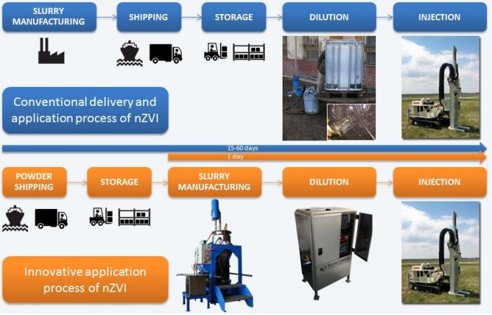 The technology is based on injection of Fe0 nanoparticles into the groundwater through application wells. This technology is environmentally friendly and cost-effective compared to methods like conventional permeable reactive barriers (PRB), pump&treat and others. NZVI slurry is applied through small injection wells with minimal negative environmental impact. Due to the nanodimensional character and suitable surface stabilization, the injected nanoparticles migrate through the rock environment, where they induce oxidation-reduction (redox) reactions with pollutants dissolved in the groundwater.