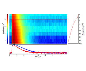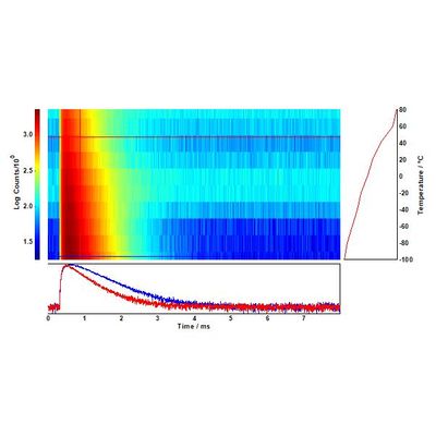 As the temperature increases, nonradiative relaxation processes decrease the overall upconversion luminescence. The dynamics of this temperature quenching process can be studied with a temperature lifetime map such as the one in Figure 4: there is a marked decrease in photoluminescence lifetime, from 640 µs to 530 µs, as T increases.