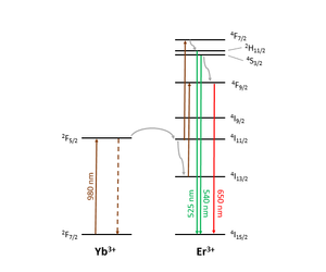 Figure 1 shows the upconversion mechanism for a common lanthanide-doped phosphor, NaY0.77Yb0.20Er0.03F4. At least two 980 nm photons are required to induce emission in the visible. Besides direct excitation of the Er3+ ion, there is energy transfer from excited Yb3+ to excited states of Er3+. Emission is in the blue, green and red regions of the visible spectrum depending on the upper Er3+ level in the transition.