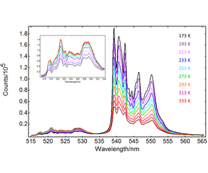 Based on this, the ratio of 525 nm and 540 nm luminescence intensities, RHS, can be used to infer the ratio of 2H11/2 to 4S3/2, which gives the temperature of the sample. Photoluminescence spectrometers such as the Edinburgh Instruments FLS1000 can be used to characterise accurately this ratio as a function of temperature. In addition to widely used cryostats, the FLS1000 can be coupled to temperature controlled stages via fibres. Such stages enable studying the same sample in the FLS1000 and a microscope, without any intermediate sample mounting steps. This application note presents temperature-dependent upconversion luminescence results for NaY0.77Yb0.20Er0.03F4 obtained in an FLS1000 spectrometer coupled to a temperature stage.
