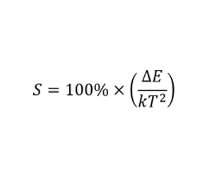 To illustrate the concept of upconversion thermometry, the low temperature region of the curve is fitted to a straight Boltzmann plot in Figure 5 (c). From this plot the relative sensitivity of the luminescence thermometry system, S, may be obtained. This is a useful parameter to evaluate a luminescence thermometer system, and is calculated as shown in the equation below.Taking the slope in Figure 5 as -∆E/k, the sensitivity at 20°C is 1.0% K-1. This result is in line with similar upconversion thermometry systems.3