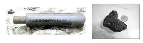 Before treatment (left), liquid coal tar coats an auger plug. After treatment (right), thermally stabilized coal tar heated to 110ºC has the consistency of asphalt.