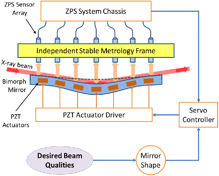 ZPS⢠sensors can be deployed along the length of the mirror to measure the curvature or complex shape of the mirror. In the case of hard xray beamlines, the ZPS system can directly measure the part of the mirror that interacts with the beam.