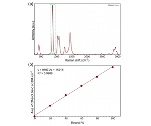 The calibration curve was created from the 5 standard solutions of known ethanol % using the marker band at approx. 880 cm-1, Figure 3(a). For vol/vol (%) measurements it was found that the increase in peak area with concentration behaves linearly. From these values the calibration curve was plotted, Figure 3(b).