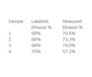 Four samples of hand sanitiser were analysed. Three were different bottles of the same brand to determine the variance between different bottles (Samples 1-3), and a further sample which proved to have much lower than expected ethanol concentration were analysed. The 3 samples of same of the same brand all show ethanol %’s over the 68% stated on the label with a variance of 3.4% between them. The second brand analysed was determined to have a lower ethanol content of 57.1%, Table 1, which would make it ineffective at killing microbes. The ethanol concentration of the hand sanitiser samples is shown by orange squares in Figure 4.