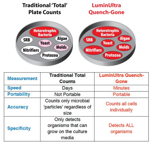 LuminUltra’s 2nd Generation ATP test kits are the first and only commercial test kits that overcome these problems. The ideal microbial growth control program in the oil & gas sector would incorporate the real-time, complete measurement of total microorganisms provided by LuminUltra’s Quench-Gone test kits, with follow-up testing done with specific culture tests to validate control mechanisms to guard against specific microorganisms.
