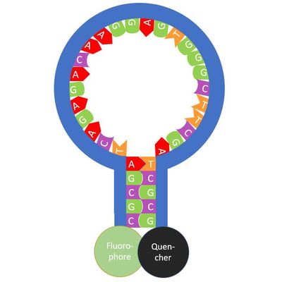 Molecular beacon probes are a sequence of nucleotides (the building blocks of DNA and RNA) that can be used to fluorescently detect the presence of a specific sequence of DNA or RNA. With real-world examples as PCR quantification, in vivo RNA detection, pMolecular beacon probes are a sequence of nucleotides (the building blocks of DNA and RNA) that can be used to fluorescently detect the presence of a specific sequence of DNA or RNA. The molecular beacon (Figure 1) is designed so that a small number of nucleotide bases (between 5 and 7) at the sequence terminals are complementary to each other and get paired forming what is called the stem. The formation of the stem creates a loop of the unpaired bases, which is termed the stem-loop or hairpin loop. Finally, at one end of the nucleotide sequence there is a covalently attached fluorophore and a fluorescence quencher at the other end of the sequence. When the molecular beacon is in this hairpin form, the quencher heavily diminishes the fluorophore fluorescence through Förster Resonance Energy Transfer (FRET) quenching.