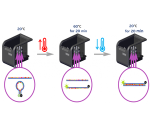 Four solutions of the molecular beacon with different cDNA concentrations were pipetted into cuvettes and placed in the four positions of the SC-27. To facilitate hybridization of the cDNA and beacon sequences, the solutions were incubated by heating at 60°C and holding at this temperature for 20 minutes. Then cooled back to 20°C and held at this temperature for a further 20 minutes. This incubation process of heating and cooling increases the hybridization rate between the molecular beacon and cDNA and is illustrated in Figure 5.