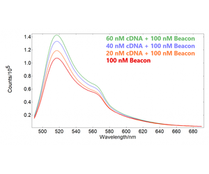 The fluorescence spectra of the four solutions after incubation were measured sequentially and shown in Figure 6. The SC-27 enables the automated measurement of four samples with the same measurement parameters. It can be seen that the molecular beacon only solution shows its characteristic emission even without any presence of cDNA, which is due to a small amount of the fluorophore being free in the solution. As the concentration of cDNA is increased, the fluorescence intensity increases due to beacons hybridizing with the cDNA and the fluorophores on the beacon becoming unquenched.