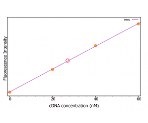 Knowing the fluorescence intensity of samples of known cDNA concentration allows a mathematical correlation between the fluorescence intensity and cDNA to be established. Using the Trend Analysis feature of Fluoracle®, the measurements in Figure 6 were used to create a calibration curve relating the emission intensity at the 516 nm peak to the cDNA concentration (Figure 7).