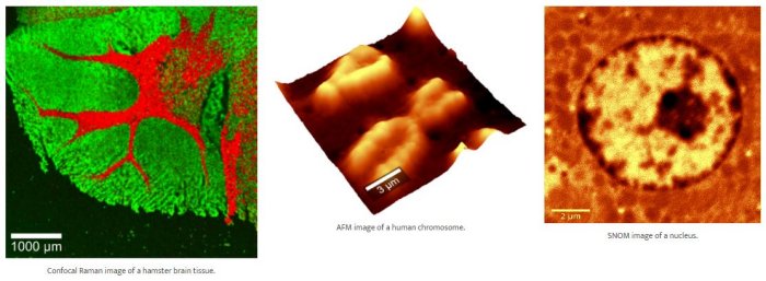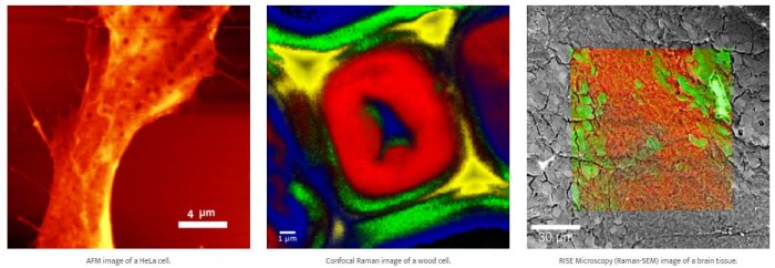 WITec’s highly versatile instruments can combine various imaging techniques to significantly increase the insights provided by measurement results. Possible combinations which can be included in a single microscope setup include confocal Raman imaging, Atomic Force Microscopy (AFM), Nearfield-Microscopy (SNOM) and Scanning Electron Microscopy (SEM). Confocal Raman imaging provides chemical information, AFM detects topography, structure, and physical properties such as stiffness, adhesion, etc. of the sample’s surface, and SNOM high-resolution measurements can optically reach beyond the diffraction limit. All WITec instrument configurations can be upgraded at any point to adapt the system to new or extended requirements.