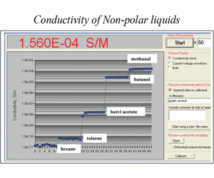 Non-polar liquids such as toluene, hexane, dodecane, etc, are important for many novel products like electronic paper, batteries, and fuel cells. Dispersions prepared on their basis depend on ionic composition, which can be characterized with conductivityNon-polar liquids such as toluene, hexane, dodecane, etc, are important for many novel products like electronic paper, batteries, and fuel cells. Dispersions prepared on their basis depend on ionic composition, which can be characterized with conductivity measurement. Utilization of this simple method can be accomplished only with a special conductivity probe capable of measuring conductivities of liquids over a very wide dynamic range, from 10-11 S/m up to 10-4 S/m.