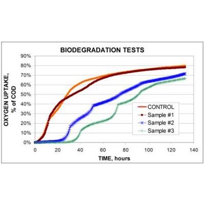 Biodegradation tests involve testing samples in response to various parameters: dilution, nutrient addition, pH, temperature, and others. The pattern of oxygen uptake in aerobic tests; nitrogen gas production in anoxic denitrification tests; methane production in methanogenic tests; hydrogen production during glycolysis; and carbon dioxide production during fermentation reactions gives a measure of the rate and extent of biodegradation of the organic constituents of the test sample.