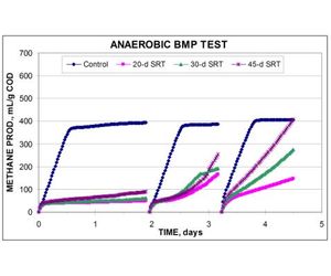 This case study shows methane production for a Control reactor and three test reactors that were operated at 20-, 30- and 45-day retention times and received three doses of industrial wastewater. The tests indicate that culture acclimation was required and incomplete methane production occurred for the lower SRT reactors.