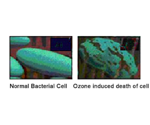 Ozone, by virtue of its higher oxidation potential, penetrates bacterial cell wall and oxidizes the cell wall components (enzymes, proteins, DNA, RNA). Cell death occurs, which is called lysis.