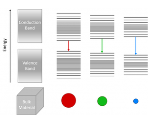 The key attraction of quantum dots is the superb control available over their band gap due to quantum confinement. In a bulk semiconductor the number of atoms is very large and the overlap of this high number of atomic orbitals creates a continuum of closely spaced ‘molecular’ orbitals which form the valence and conduction bands. However, if the semiconductor is reduced to a nanoscale size the situation changes. There are fewer atomic orbitals overlapping and the valence and conduction bands are no longer continuous and are instead formed of discrete energy levels, and more importantly the band gap between the valence and conduction bands becomes wider which is known as quantum confinement (Figure 1). Nanoparticles that are small enough to have their band gap influenced by quantum confinement are known as quantum dots and by precisely controlling the size of the quantum dots during synthesis the photoluminescence emission and absorption wavelengths can be finely tuned, which is ideal for optoelectronic applications.