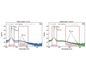 The PLQY of the quantum dots was calculated using the built-in quantum yield wizard of Fluoracle. In the wizard the desired scattering and emission integration ranges are defined, and Fluoracle then integrates over the reference and sample spectra and calculates the quantum yield using, where SSample and SRef are the integrated intensities of the scattering peaks of the sample and reference respectively, ESample is the integrated intensity of the sample emission and ERef Scaled is the integrated intensity of the scaled reference emission. The scaled reference emission is to account for higher intensity of scattered light in the sphere when the weakly absorbing reference is present. This higher scattering intensity causes a higher background emission signal in the sphere compared to when an absorbing sample is present. Fluoracle therefore contains the option to automatically scale the background emission by the ratio of sample and reference scattering peak heights, which results in the scaled reference background shown in grey in Figure 4 and results in a more accurate background subtraction for the PLQY calculation. PQD-A was found to have a poor PLQY of 3.3% while PQD-B has an excellent PLQY of 56.0%. The value of 56.0% for PQD-B highlights the promise of these new materials and recently PLQY values for similar perovskite quantum dots of over 90% have been reported in the literature which is comparable to traditional cadmium based dots.4