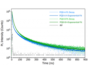 The final photophysical parameter that is important for the characterisation of perovskite quantum dots is the photoluminescence lifetime which provides information on the nature of the recombination processes inside the quantum dot. The PL decays of PQD-A and PQD B were measured using Time-Correlated Single Photon Counting (TCSPC) and are shown in Figure 5. The PL decays were found to be highly complex and cannot be fit with a single time constant which is consistent with previous reports.4 The complex decay behaviour is likely due to multiple recombination processes occurring within the quantum dot such radiative and non-radiative recombination channels and the fact there will be a distribution of dots each with slightly different lifetimes. The PL decays were fit with a four component exponential decay model (Eq. 2) using Fluoracle’s inbuilt reconvolution fitting routine. Reconvolution fitting takes into account the pulse shape of the excitation laser and the detector response to provide a more reliable fit.